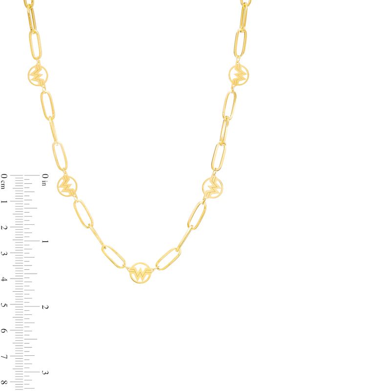 A modern look gets an action-packed makeover in this subtle logo station necklace.