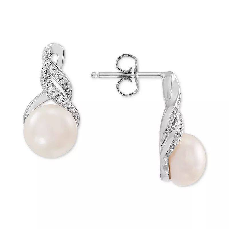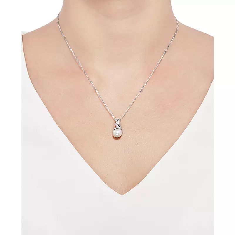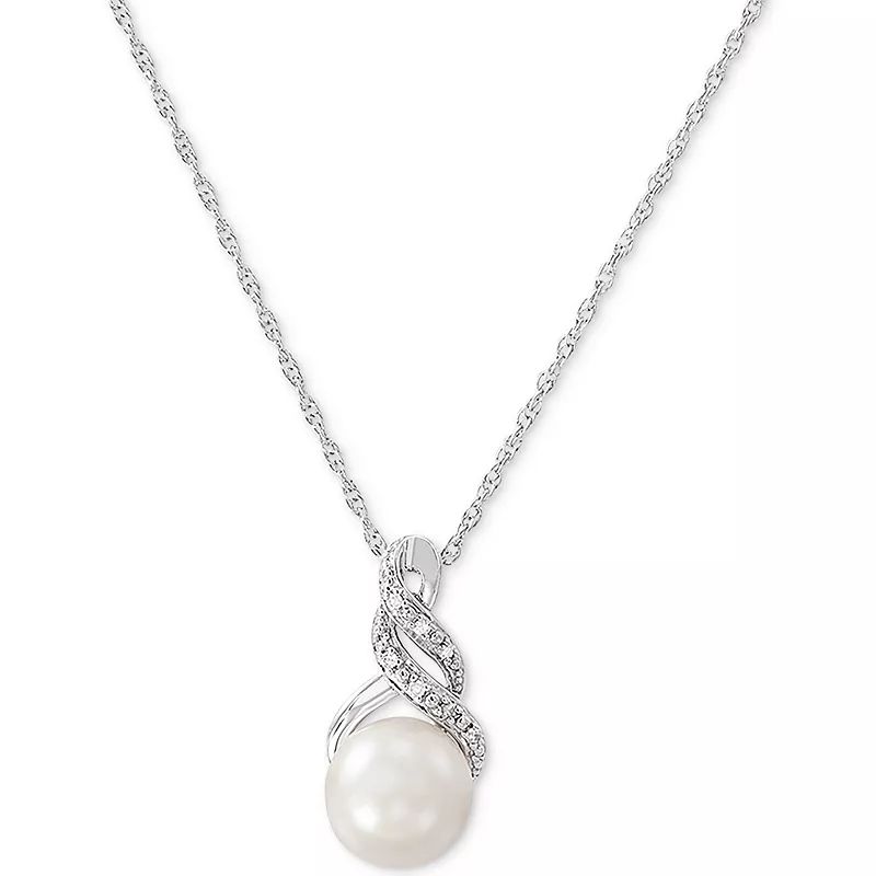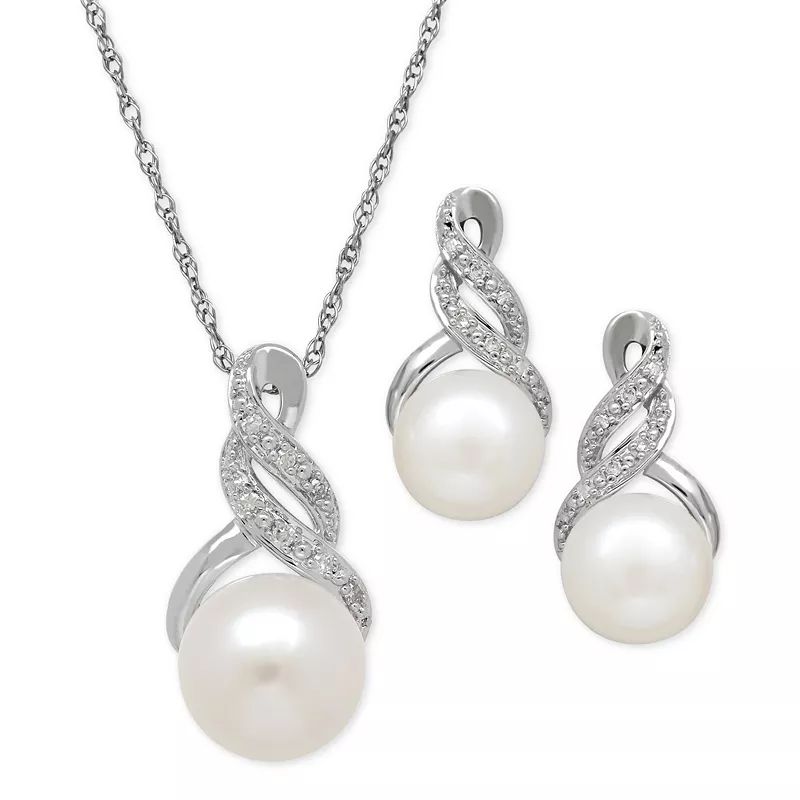 A diamond accented swirl adds a hint of glamour to this stunning cultured freshwater pearl (8 & 9mm) pendant necklace and matching stud earrings.