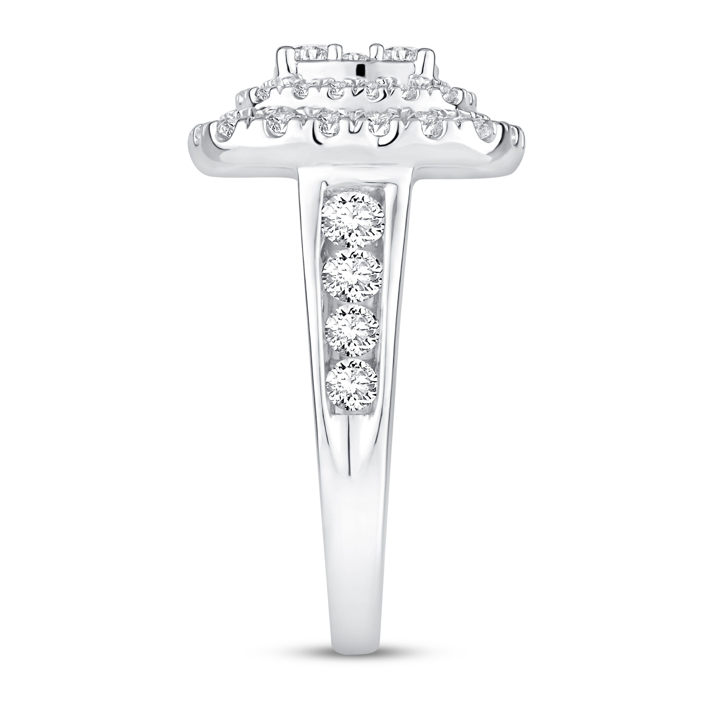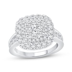 This breathtaking women’s engagement ring features a myriad of brilliant round diamonds stacking atop a 14K white gold band. Sparkling diamonds line halfway down each side of the band to bring the total diamond weight to an impressive 2 carats.