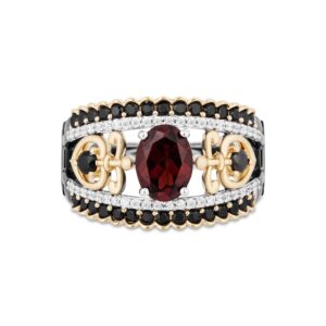 Crafted in two-tone sterling silver and 10K gold, this ring features an 8.0 x 6.0mm oval royal red garnet flanked by a sword-shaped black diamond center heart in warm gold. Gleaming white diamonds are set in a silver border along with a captivating black diamond and scalloped gold ribbon. A crown is set below the black rhodium plated setting to complete this royal look. This split setting style is so mesmerizing with 1 carat of diamonds and a brilliant polished shine that you will never imagine. This ring is only available in size 7.